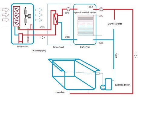 Het water voor uw woning- en zwembadverwarming komt van het buffervat dat deel uitmaakt van uw warmtepompsysteem. De temperatuursensor van het buffervat waakt erover dat het buffervatwater een constante temperatuur heeft van +50 °C. Als de temperatuur onder dit niveau zakt, schakelt uw warmtepomp aan om de temperatuur terug op peil te brengen. Het water aan de uitgang van uw buffervat is dus altijd ongeveer +50 °C. Vandaar stroomt het naar uw warmteafgiftesysteem (radiatoren, convectoren of vloerverwarming) én naar uw zwembad. Kortom: u benut uw warmtepomp optimaal!