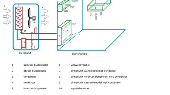 - Het koelgas gaat naar de warmtewisselaar van de buitenunit en de cyclus start opnieuw.